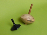 2019De donkere tol is gemaakt van ebbenhout, de grotere (7cm hoog) heeft met donker hout ingelegde rondjes. Het draaien van zo'n tol vereist veel nauwkeurigheid. Door het inleggen wordt de zwaartekracht veranderd. Niet alleen leuk om te zien, ook draaien ze allebei goed.