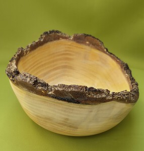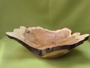 2024Ginkgo biloba, de Japanse notenboom groeit al sinds enkele eeuwen in Nederland, maar is niet zo bekend. Het hout is licht (van gewicht) en heeft allerlei fraaie kleurschakeringen. Fijn om te draaien. Deze schaal heeft een rand waar de schors nog zichtbaar is.